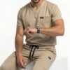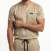 Uniforme médical moderne composé d’un haut à col V et d’un pantalon ajusté.