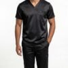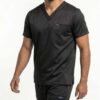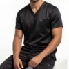 Uniforme médical moderne composé d’un haut à col V et d’un pantalon ajusté.